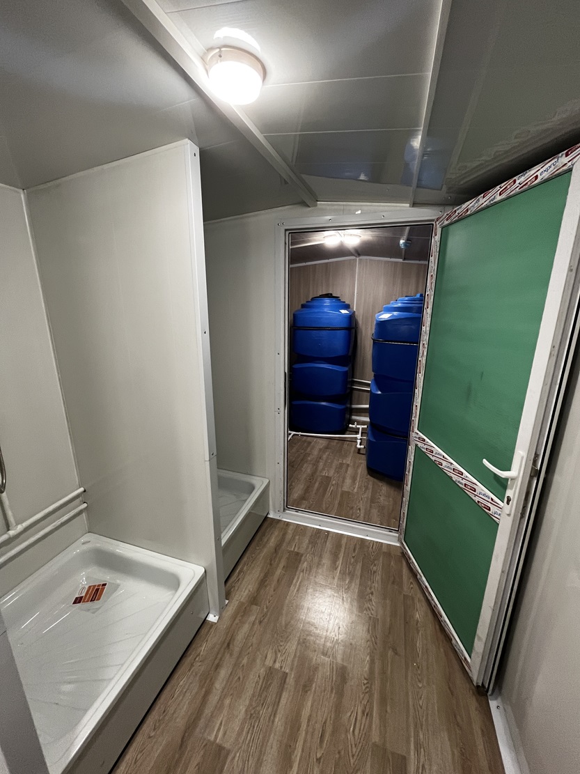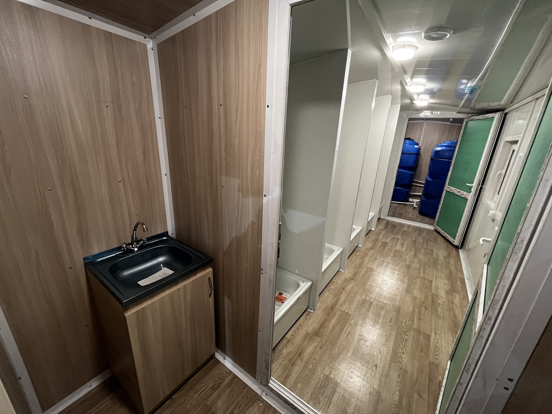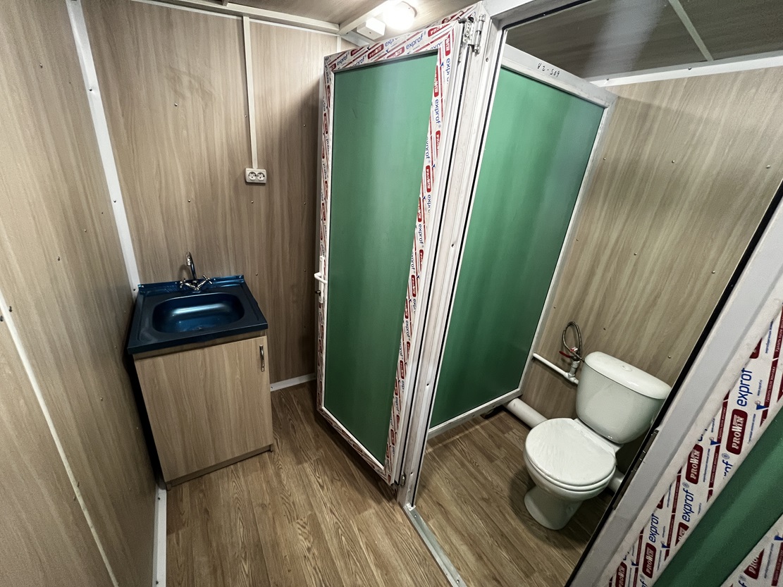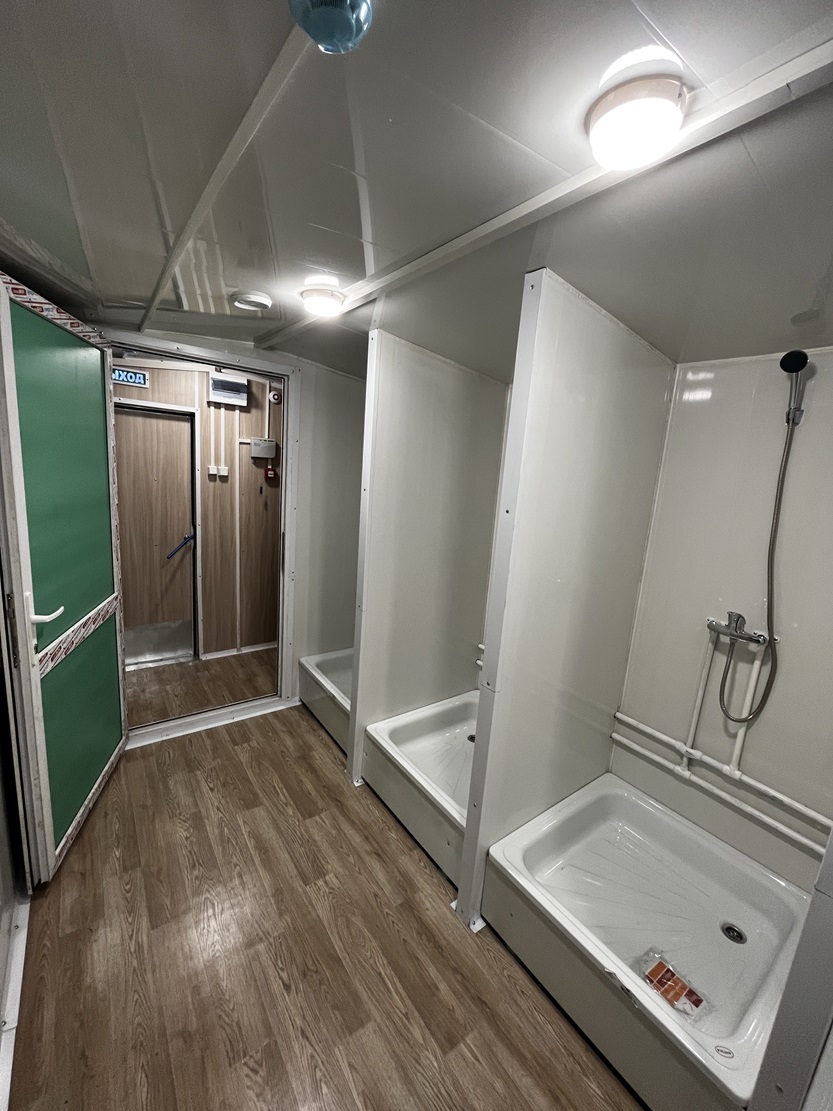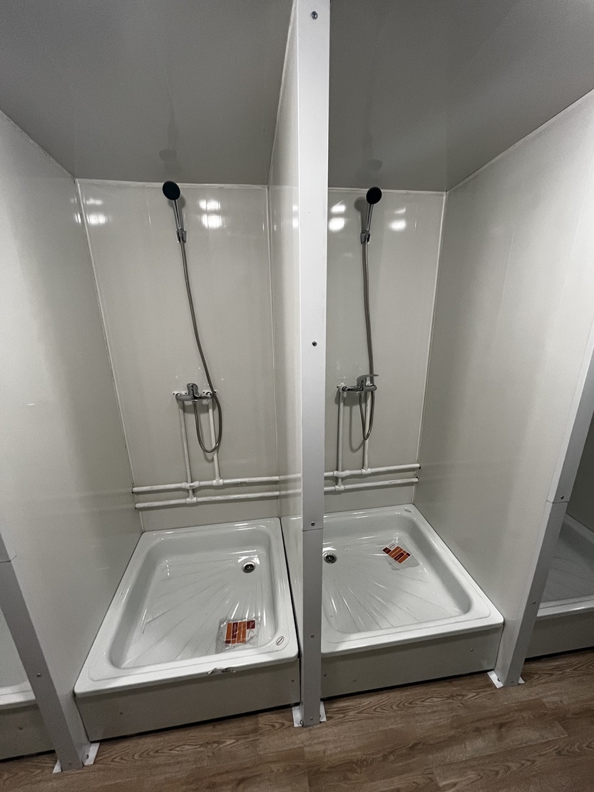 Внешняя: лист металлический, профильный С-8 0,6мм (Полимерный, цвет по согласованию с заказчиком) Внутренняя: потолок, стены – ЛДСП плита Внутренняя отделка: Душевая ПВХ панели.