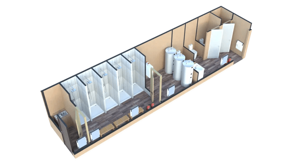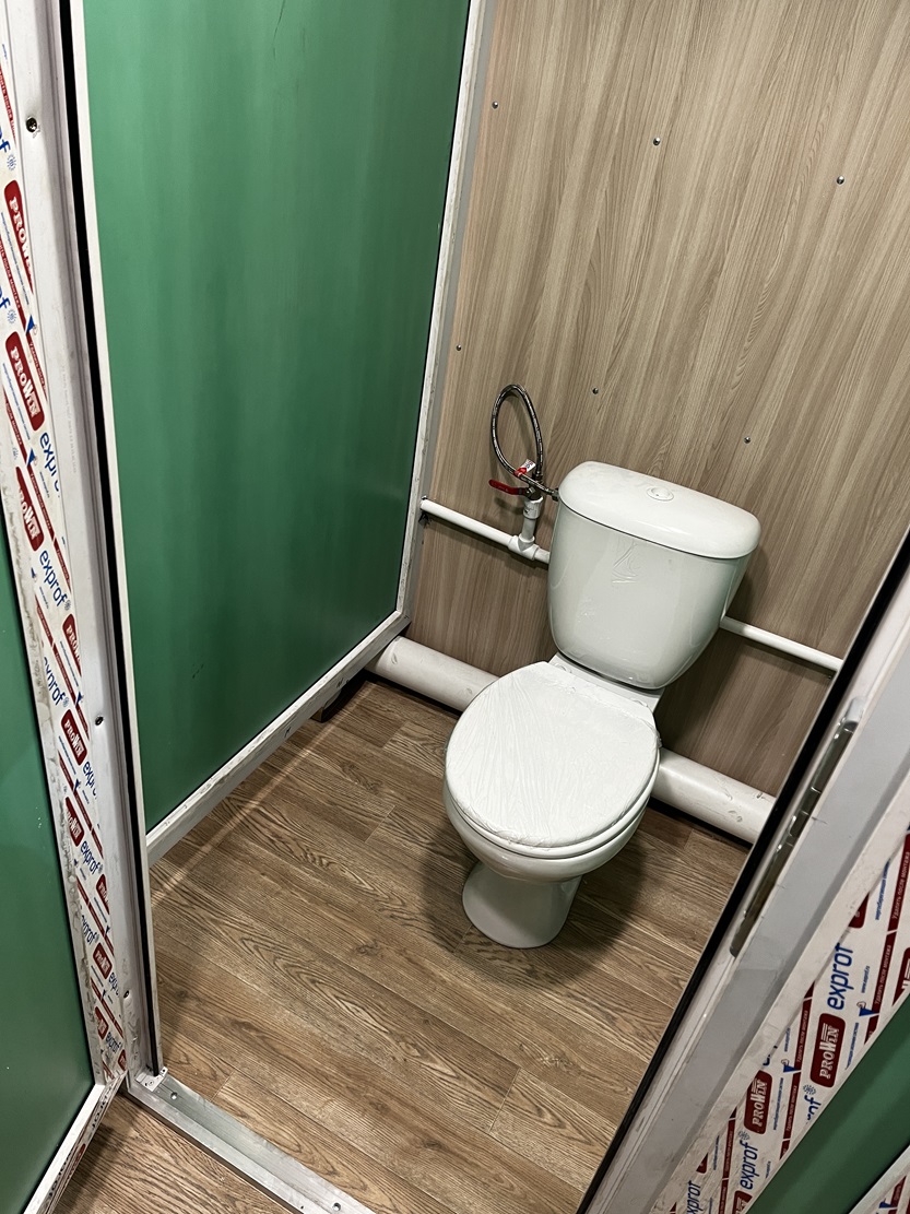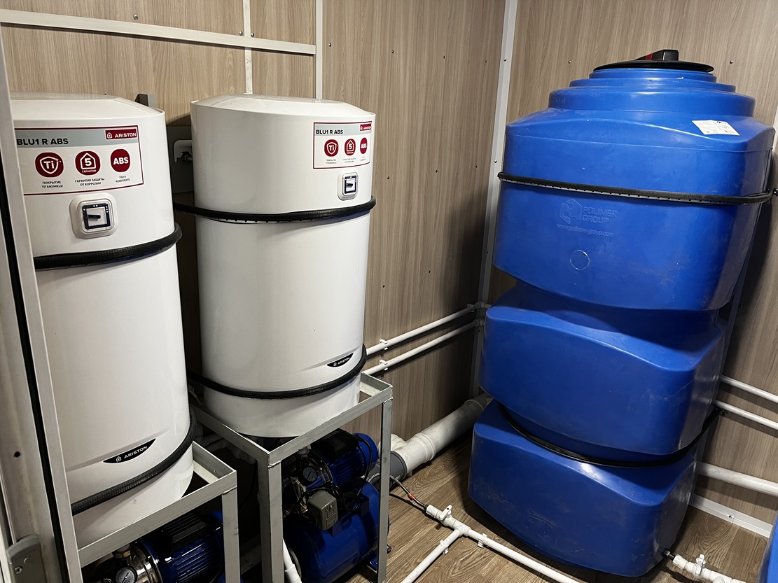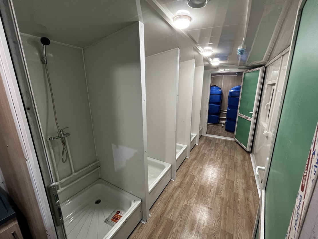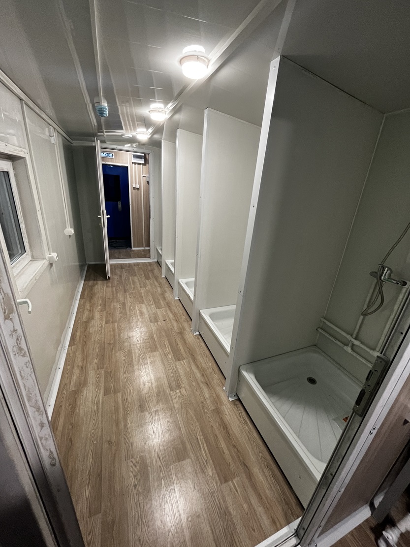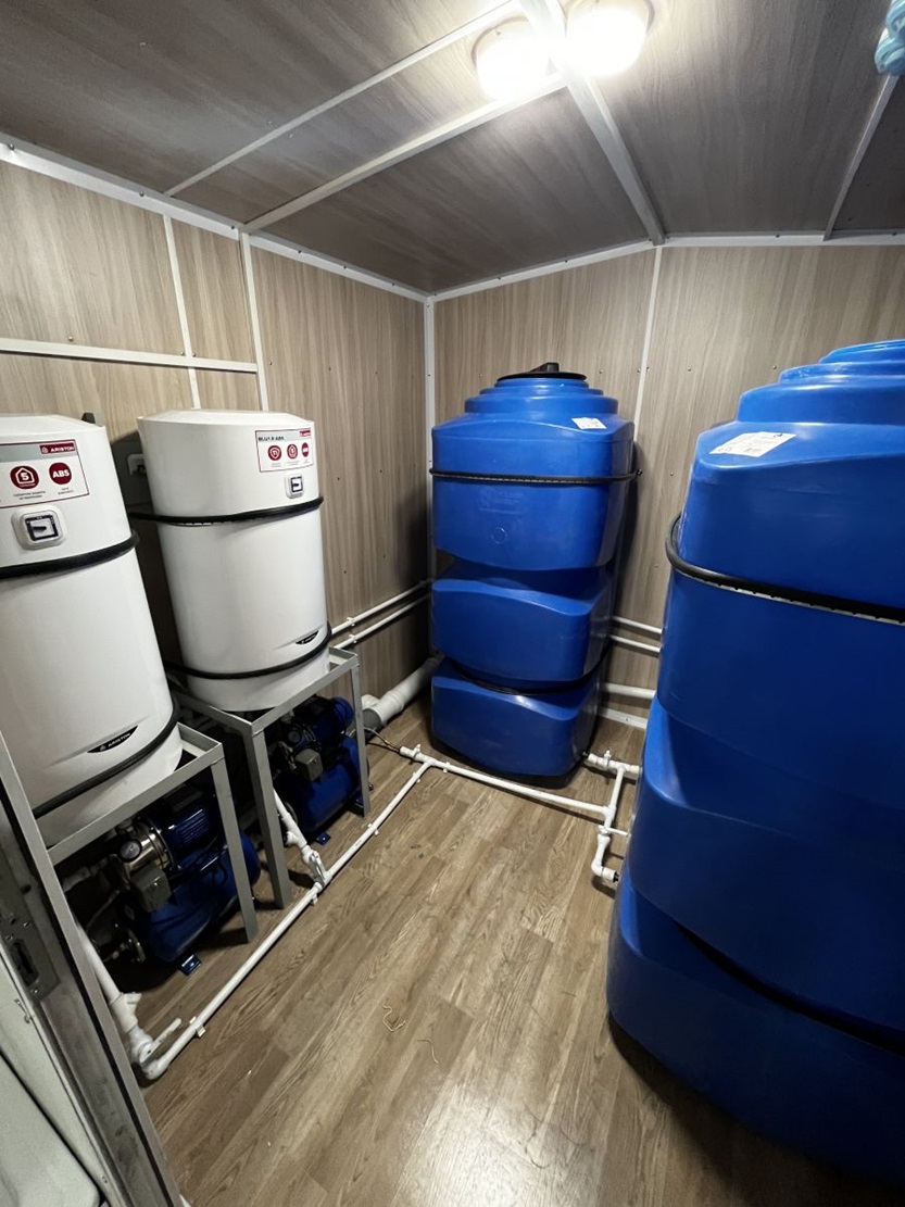 Внешняя: лист металлический, профильный С-8 0,6мм (Полимерный, цвет по согласованию с заказчиком) Внутренняя: потолок, стены – ЛДСП плита Внутренняя отделка: Душевая ПВХ панели.
