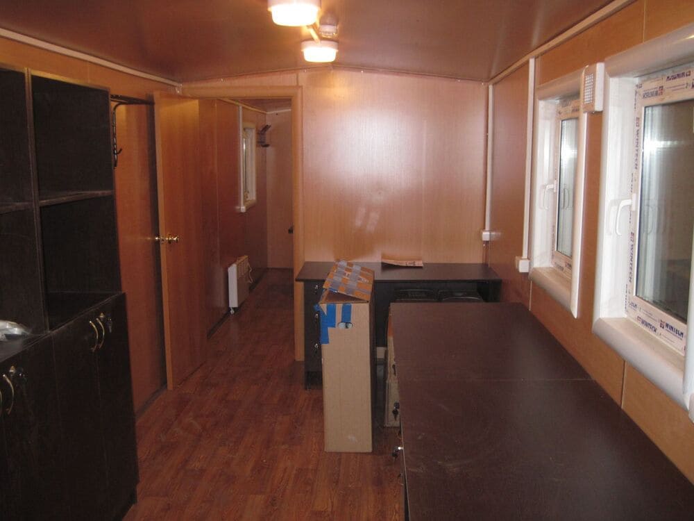 Пол выполнен из влагостойкой фанеры толщиной 12 мм и покрыт линолеумом. В зависимости от назначения мобильного здания используется отделка по требованию заказчика.
